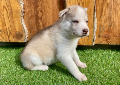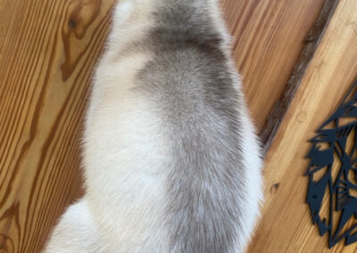 Magnifique pelage noir et blanc et yeux bleus. D’un caractère très calme, joueur et non dominant, il est facile à vivre dans la meute.